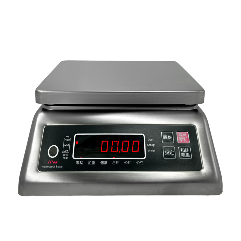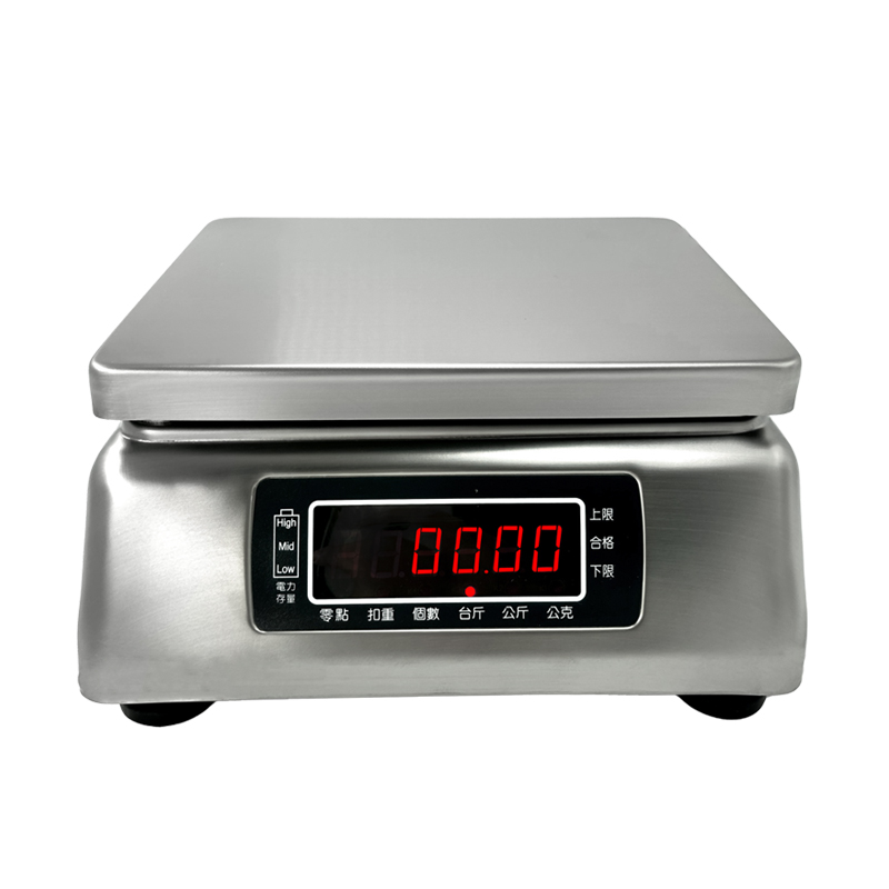 2.全机304#不锈钢打造,坚固耐用,防虫、防腐性高 3.独特前后双面显示萤幕,多工作业更方便 4.15mm红色LED萤幕显示,数据清晰 5.高精度防水秤重感应器,全防水密封设计主板,秤重速度极快稳定 6.蓄电功能,满电状态下约可使用120小时 7.具电量显示及内建省电装置 8.一键单位转换,具有kg公斤、g公克、t台两等多种单位可选 9.具有上下限警示功能、简易计数、抗风震设定
